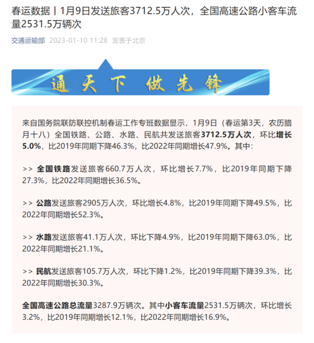 來自國務院聯防聯控機制春運工作專班數據顯示,1月9日(春運第3天,農歷臘月十八)全國鐵路、公路、水路、民航共發送旅客3712.5萬人次,環比增長5.0%,比2019年同期下降46.3%,比2022年同期增長47.9%。其中: