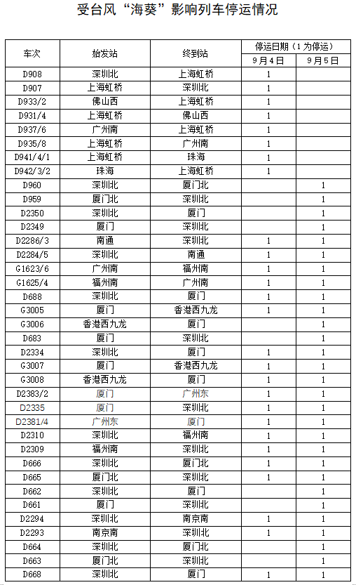 受臺風“海葵”影響 鐵路部門停運途經杭深鐵路部分旅客列車
