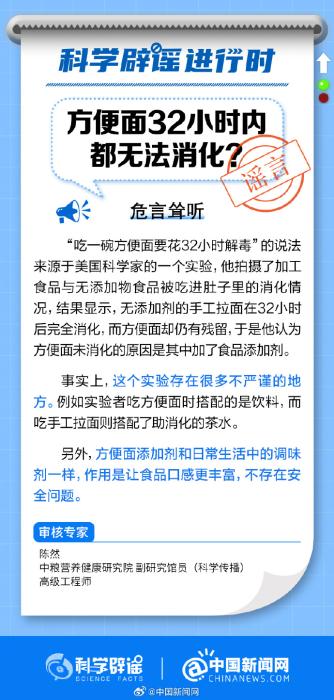 中新網8月1日電 “吃一碗方便面要花32小時解毒”的說法來源于美國科學家的一個實驗,但這個實驗存在很多不嚴謹的地方。方便面添加劑和日常生活中的調味劑一樣,作用是讓食品口感更豐富,不存在安全問題。(來源:@科學辟謠 @中國新聞網 )