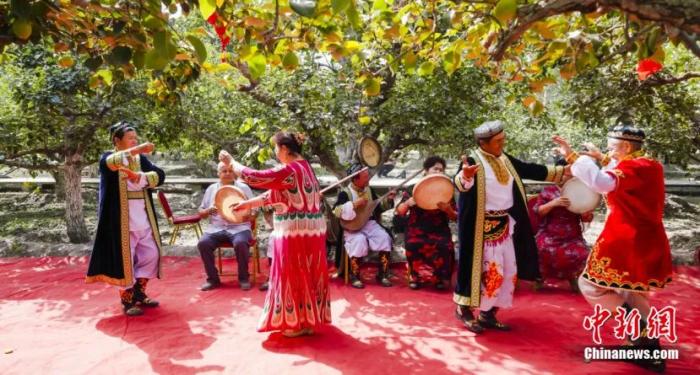 香梨成熟的季節,當地村民喜迎香梨成熟,歡快起舞。姚謙 攝