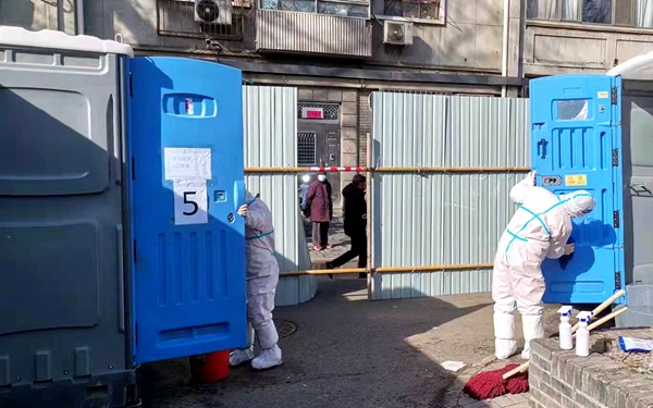 剛封閉不久,北新橋街道后永康胡同東口便增加了2座臨時單坑的移動公廁,為后永康胡同1號院、11號院隔離居民和防疫人員提供服務;民旺社區周邊胡同連夜搭建了12座單坑臨時移動公廁,在民旺南胡同為底商設置2座單坑臨時移動公廁;在北新橋育樹胡同周邊,11座移動公廁也安裝完成。