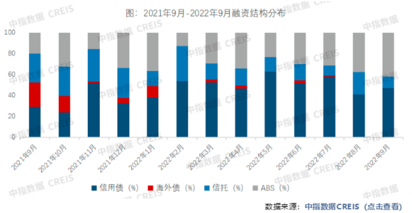 2022年1-9月,房地產企業非銀融資總額7331.5億元,同比下降52.6%。從融資結構來看,信用債占比50.2%,同比提升19.9個百分點;海外債占比僅為2.4%,同比下降14.0個百分點;信托占比16.0%,同比下降15.1個百分點;ABS占比31.4%,同比提升9.3個百分點。前三季度非銀融資總額分別占比33.1%、35.1%、32.1%,各季度融資比例差異不大,并未出現明顯的融資高峰期。