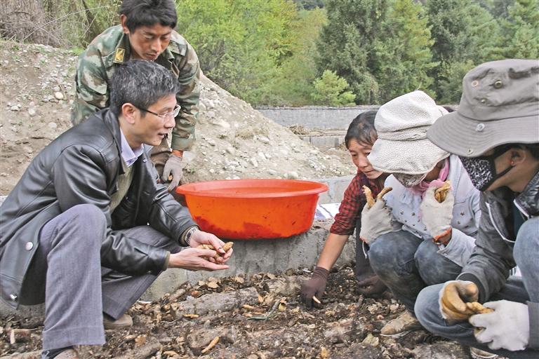 廣東省第七批援藏工作隊成員肖國鑫(左一)在波密縣指導當地農牧民種植天麻。