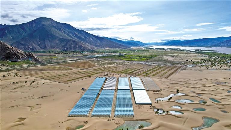 國家農業產業化示范企業——西藏綠之源現代農業科技股份有限公司二期項目,如同一片“綠洲”鑲嵌在沙丘之中。