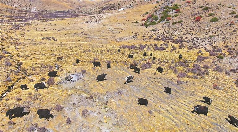 墨竹工卡縣日多鄉拉龍村4組的牧場上,牦牛在悠閑地吃草。記者 格桑倫珠 攝