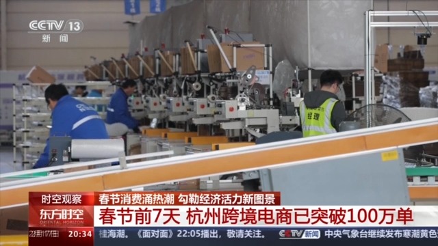 春節期間,在杭州跨境電商綜試區,一排排貨架上整齊碼放著來自世界各地的“特產”,工作人員正在分揀、打包,一派繁忙景象。