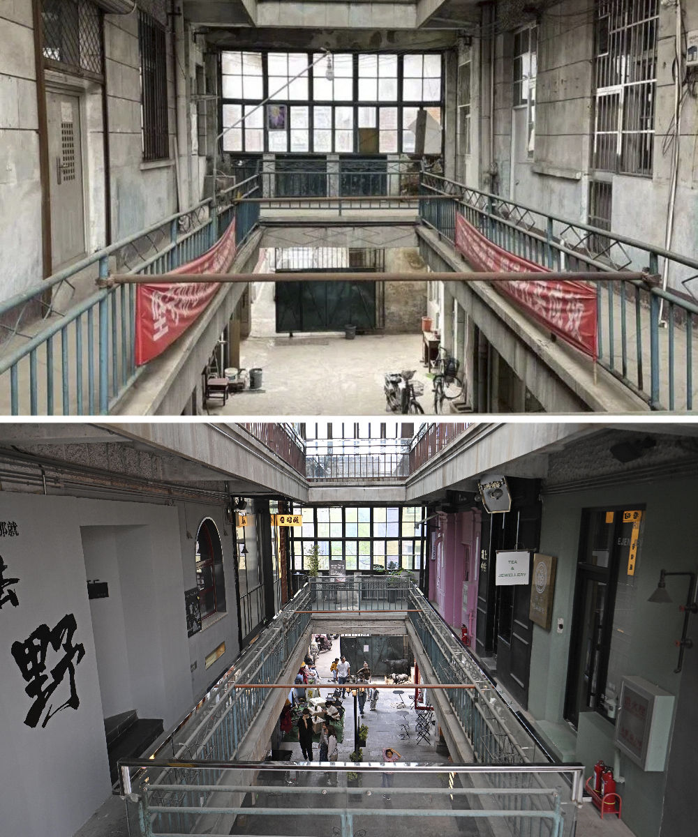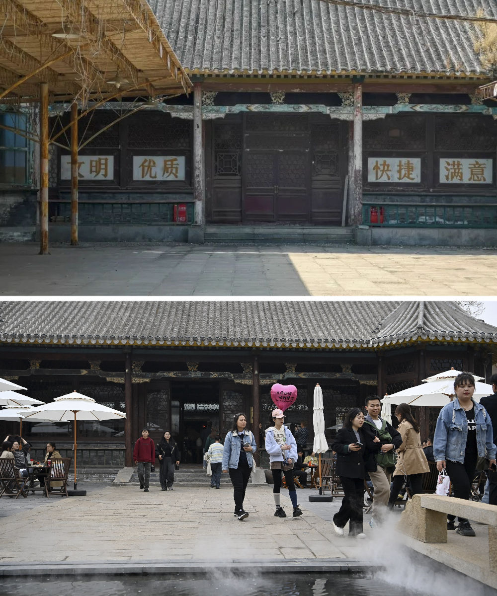 拼版照片:上圖是改造前的先農大院(資料照片)。下圖是游客在位于五大道的先農大院內游覽(4月6日攝)。始建于1925年的先農大院是五大道建成最早的建筑群之一,融合了英式聯排住宅、英式獨棟別墅等多種特色的建筑風格。歲月變遷,這些建筑一度損壞嚴重,配套設施老化。2006年起,天津啟動先農大院整理項目,對街區居民進行了騰遷,對建筑進行了加固修繕,恢復了街區的歷史原貌,引進了餐飲、文化展示、辦公等業態,使這里形成了環境優雅的公共藝術和展示建筑遺產的城市新空間。