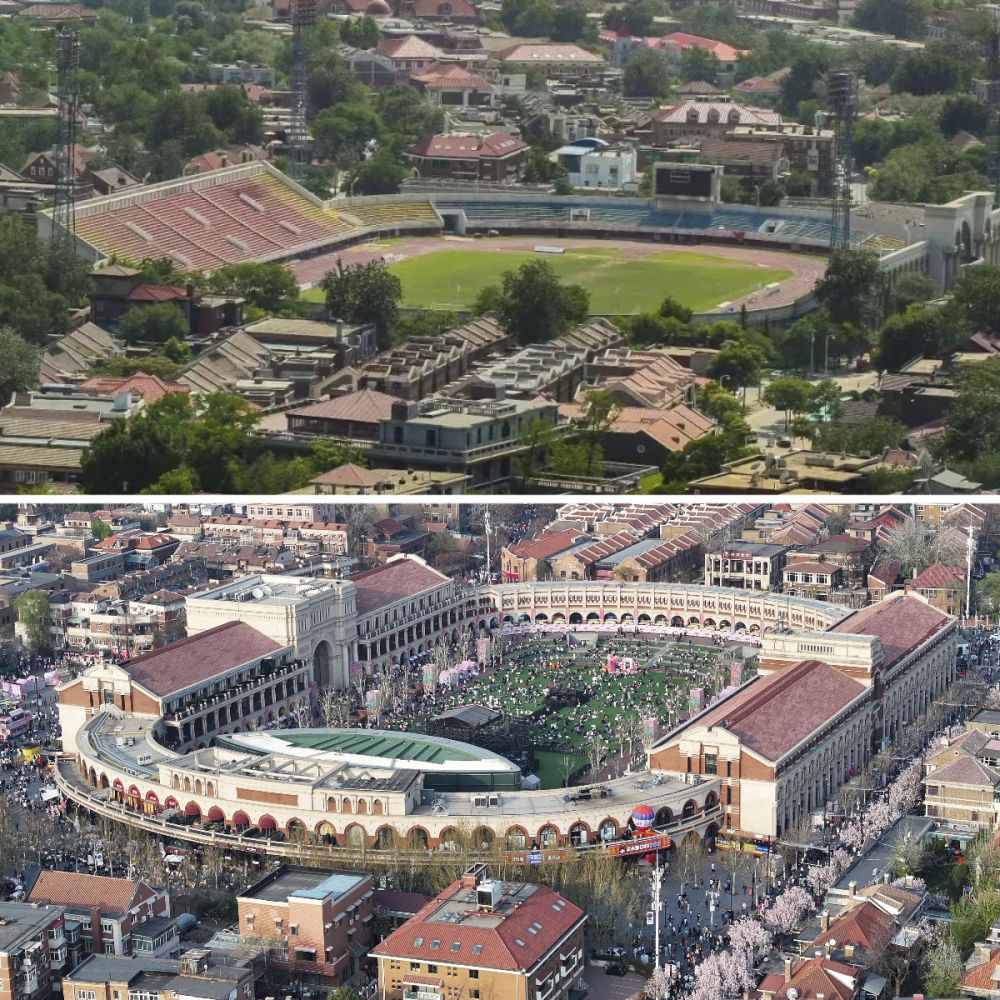 拼版照片:上圖是位于五大道的民園體育場(資料照片);下圖是位于五大道的民園廣場(4月6日攝)。民園廣場的前身是始建于1920年的民園體育場,這里也是中國的第一個燈光足球場。經過提升改造,現在的民園廣場已經成為中西合璧的“城市會客廳”。