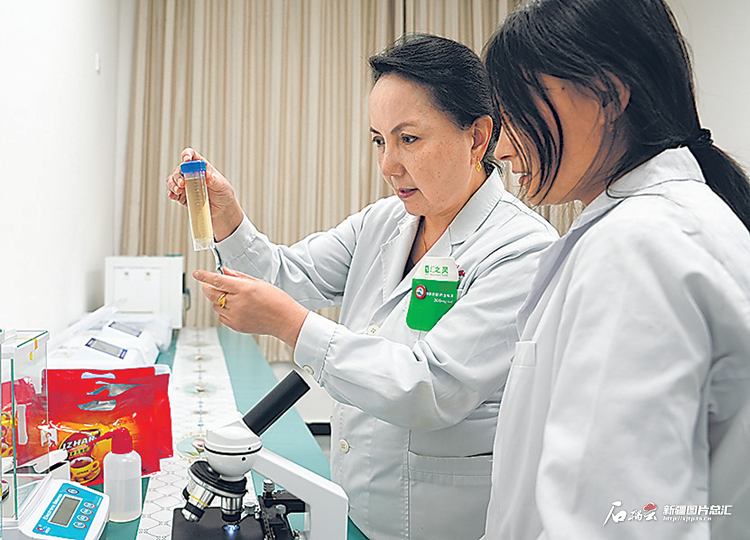 新疆醫資豪健康科技有限公司技術人員在研究配制新茶葉。乃比江·艾則孜攝