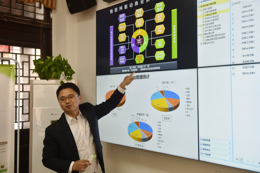 “漁博士”沈杰在浙江省湖州市菱湖鎮創辦的公司內介紹匯集養殖戶、飼料廠商、銷售檔口、金融機構等相關方的物聯網平臺(資料照片)。