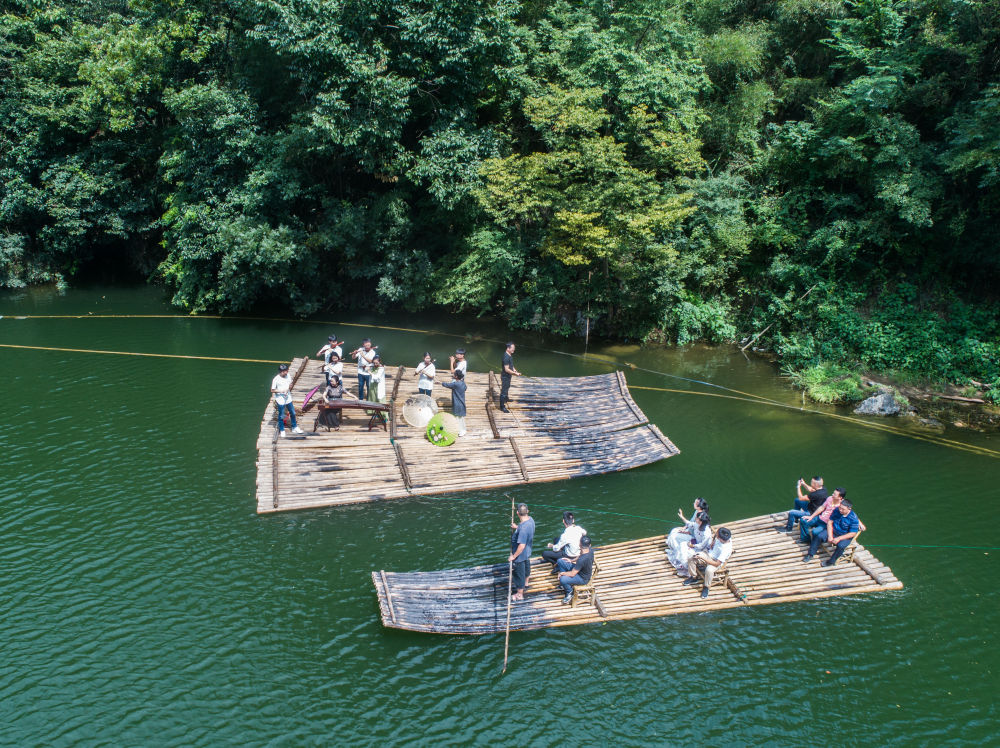 在杭州余杭區中泰街道,演奏者在竹排上演奏竹笛(資料照片)。 新華社記者 徐昱 攝
