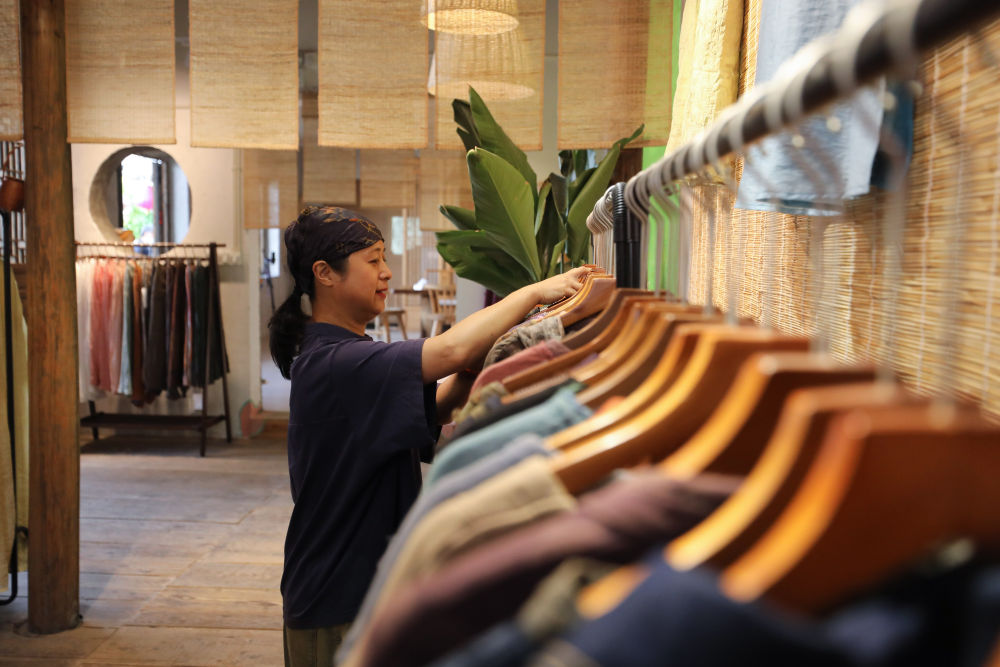 2023年5月23日,在浙江省義烏市李祖村,“農創客”鮑麗萍在店鋪里整理服裝產品。 新華社記者 杜瀟逸 攝