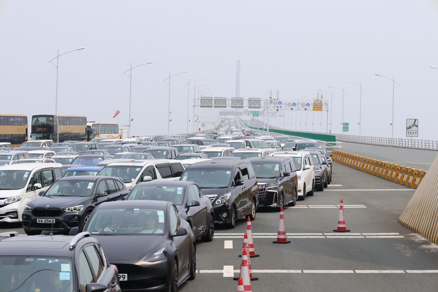 2024年3月9日拍攝的港珠澳大橋橋頭等待北上的車輛。港珠澳大橋邊檢站的數(shù)據(jù)顯示,截至3月9日21時(shí),經(jīng)該站查驗(yàn)的出入境“港車北上”車輛已突破50萬輛次。邊檢部門介紹,自2023年7月1日“港車北上”政策正式實(shí)施以來,駕駛單牌私家車“北上”的香港居民數(shù)量持續(xù)上升。 新華社發(fā)(王相國(guó)攝)
