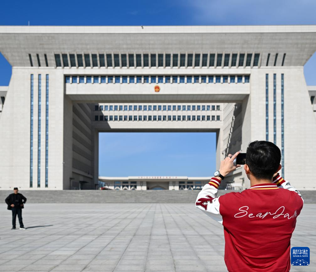 4月18日11時許,游客在霍爾果斯口岸新國門拍照留念。