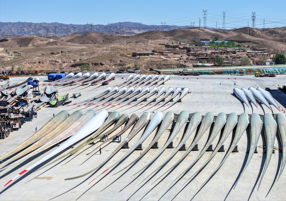 2024年5月11日拍攝的碼放在內(nèi)蒙古包頭市石拐區(qū)一家風電設備制造企業(yè)廠區(qū)內(nèi)的葉片(無人機照片)。