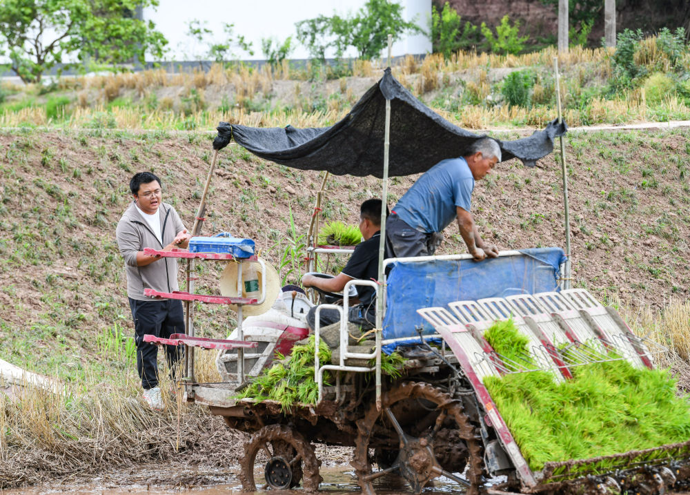 在四川成都東部新區董家埂鎮小河村,舒星宇(左)在和插秧機手溝通機插秧的注意事項(5月15日攝)。