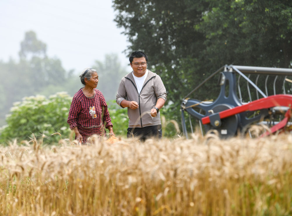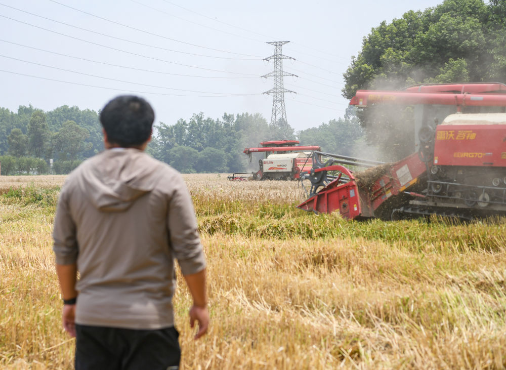 在四川成都崇州市三江街道古泉村,舒星宇在麥田邊觀看小麥收割機作業(5月15日攝)。