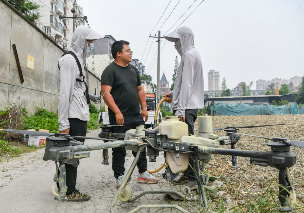 在四川成都溫江區萬春鎮,舒星宇(中)和植保無人機飛手在溝通當天打藥的區域和作業時間(5月16日攝)。