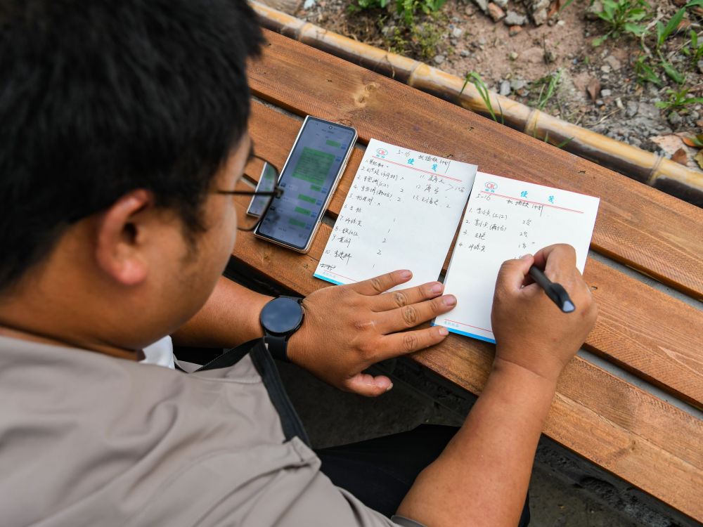 在四川成都崇州市大劃街道石橋村,舒星宇接到種植大戶的電話,溝通農機服務需求(5月15日攝)。