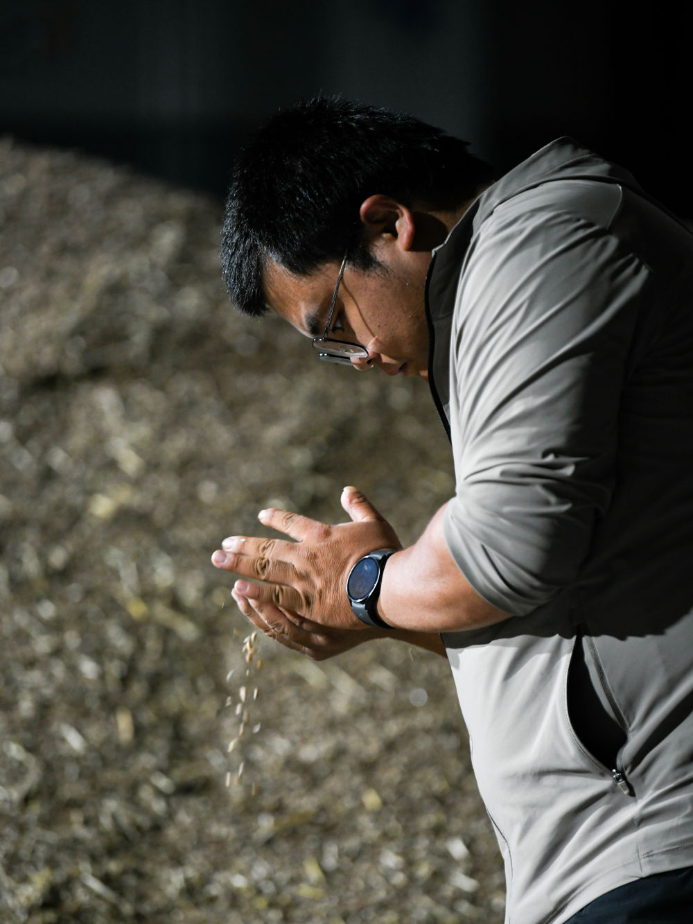 在四川成都崇州市萬茂欣欣農機專業合作社,舒星宇在查看庫房待烘干小麥的情況(5月15日攝)。