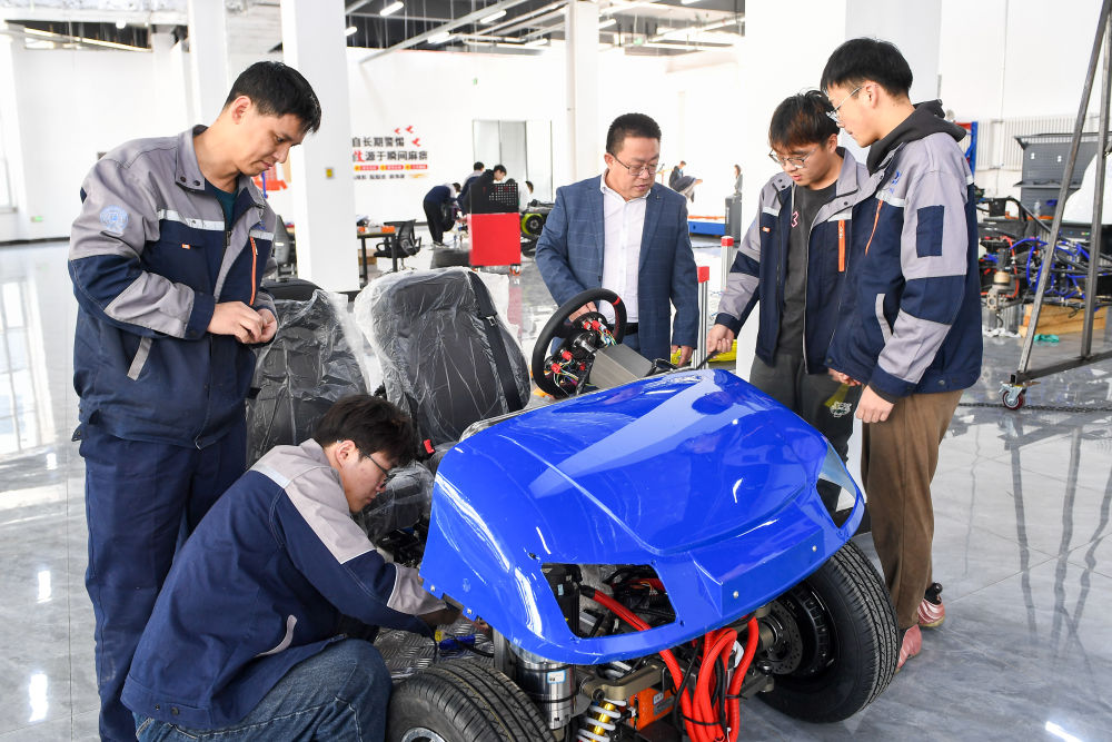 2024年3月13日,長(zhǎng)春市麥迪克智行汽車科技有限公司,吉林大學(xué)汽車工程學(xué)院教授靳立強(qiáng)(右三)與同事檢查智能底盤(pán)樣車。新華社記者 張楠 攝