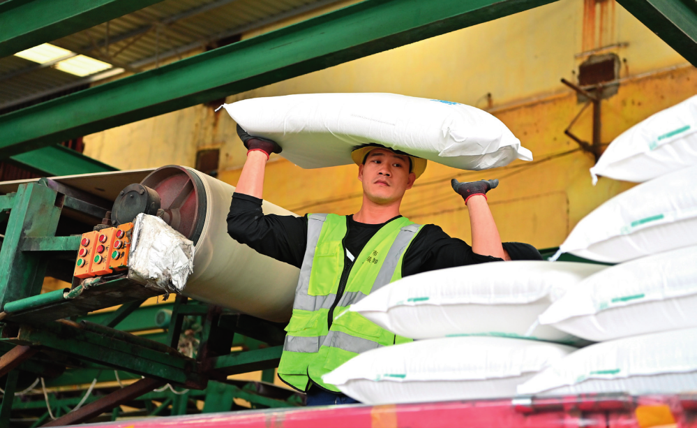工作人員在廣西來賓小平陽(yáng)湘桂制糖有限公司將白糖裝車(2023年12月12日攝)周華攝