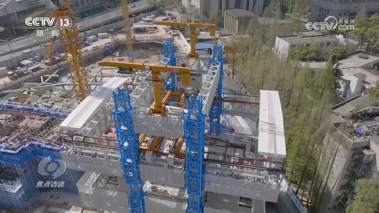 在湖北一家工廠,標(biāo)準(zhǔn)化施工構(gòu)件由工廠生產(chǎn)交付后,再由高空造樓機(jī)像拼積木一樣,將它們快速精準(zhǔn)吊裝。這樣裝配式一體化的施工方式,能讓單棟樓的總工期節(jié)約近兩個(gè)月。