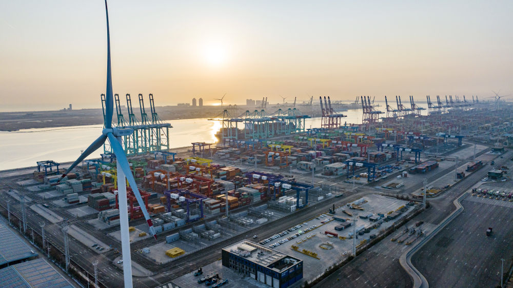 看似平常的碼頭作業,背后卻另有玄機——整個過程達到了“零碳”排放。2021年底,隨著兩臺風機葉片緩緩啟動,這座全球首個“智慧零碳”碼頭的智慧綠色能源系統開始并網發電,通過風電、光伏發出的綠色能源,源源不斷為碼頭生產提供能源。