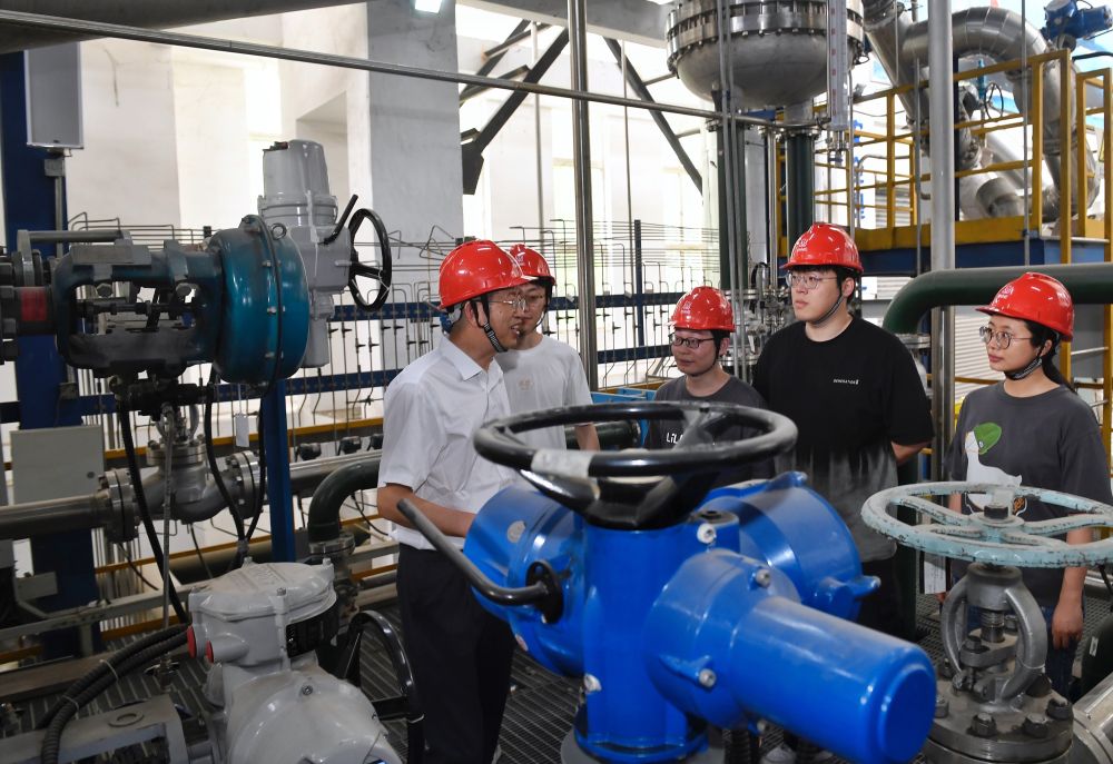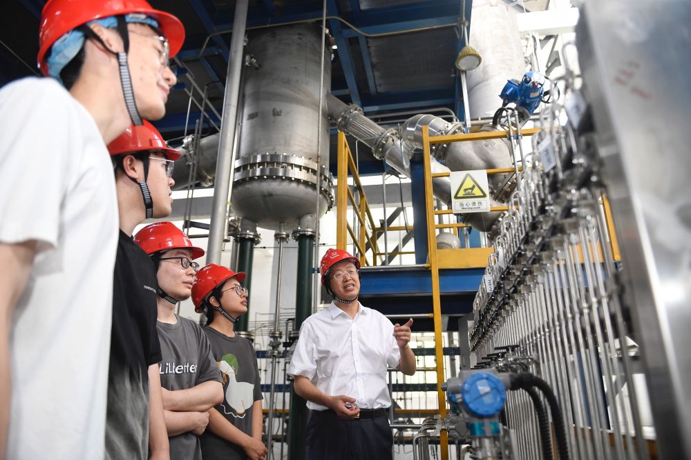 5月24日,在位于成都的中國核動力研究設計院內,鐘元章(左一)與團隊年輕人在試驗臺架上交流。