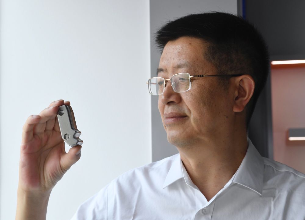5月24日,在位于成都的中國核動力研究設計院內,鐘元章在展示科研人員歷時四年研制的控制棒驅動機構鉤爪。鐘元章介紹,小小鉤爪可提拉上百斤的控制棒,團隊歷時四年才研制成功,做了1800萬步帶載荷耐磨試驗,驗證其使用壽命。