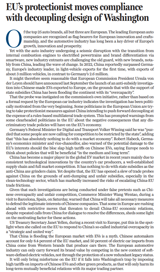 原標(biāo)題:EU's protectionist moves compliance with decoupling design of Washington