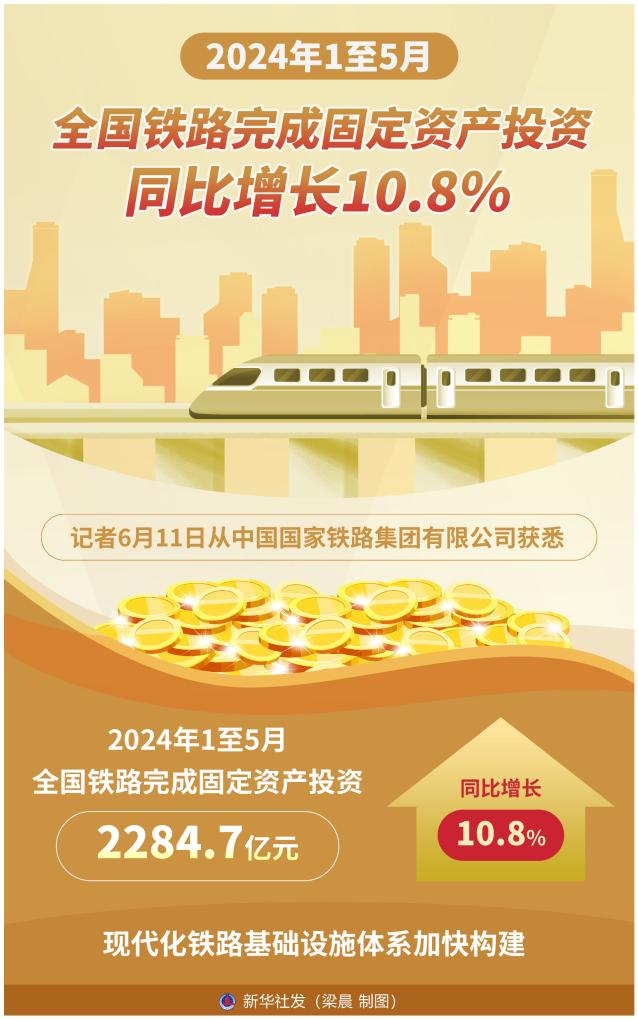 新華社北京6月11日電(記者樊曦、韓佳諾)記者11日從中國國家鐵路集團有限公司獲悉,今年1至5月,全國鐵路完成固定資產投資2284.7億元,同比增長10.8%,現代化鐵路基礎設施體系加快構建。