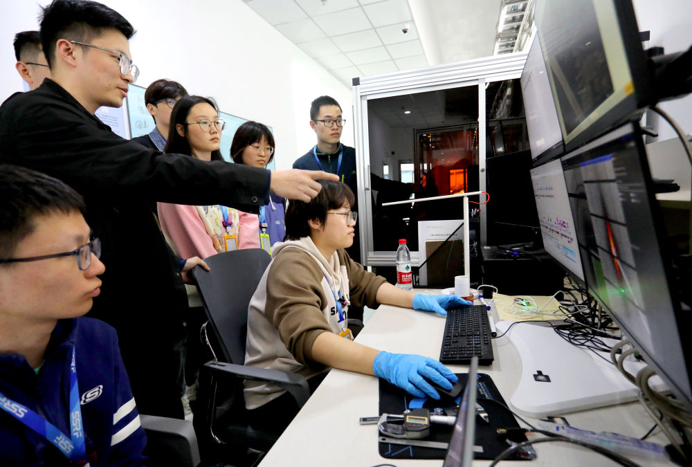 2024年4月10日,安徽省先進功能高分子薄膜工程實驗室團隊成員在上海同步輻射光源實驗線站查看討論實驗數(shù)據(jù)。