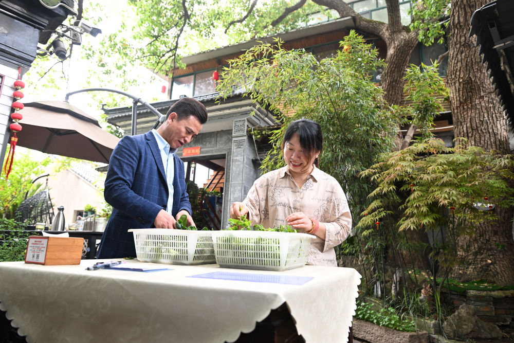 2024年4月11日,在江蘇省蘇州市吳中區(qū)金庭鎮(zhèn),退捕漁民沈雪榮和妻子沈燕燕在自家經(jīng)營(yíng)的農(nóng)家樂“美味漁家蟹園”擇菜?!巴瞬逗?,太湖的生態(tài)環(huán)境越來越好,游客越來越多,我們家的農(nóng)家樂生意也越來越紅火?!鄙蜓s感慨道。