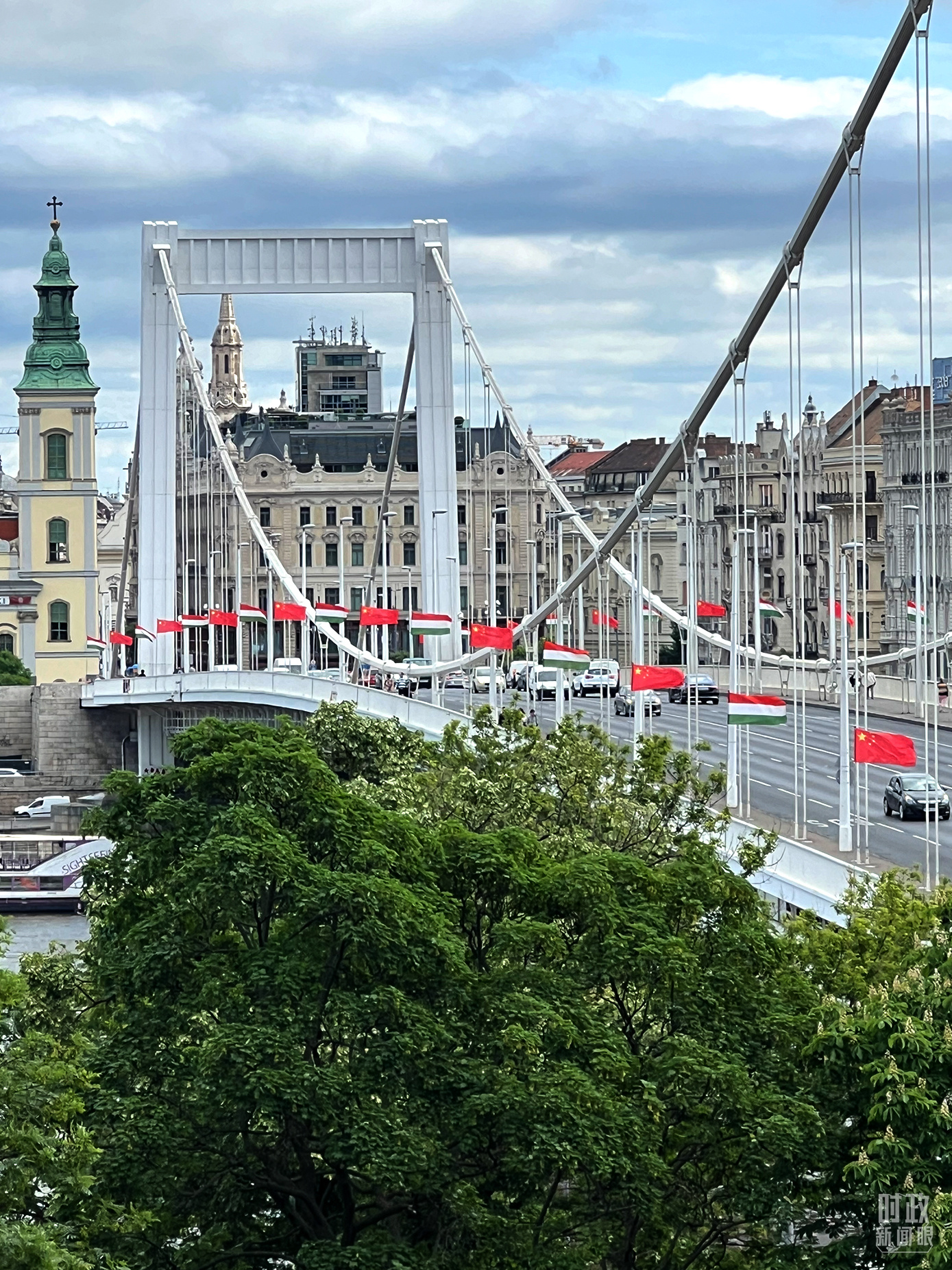 懸掛中匈兩國國旗的布達佩斯伊麗莎白大橋。(總臺央視記者石偉明拍攝)