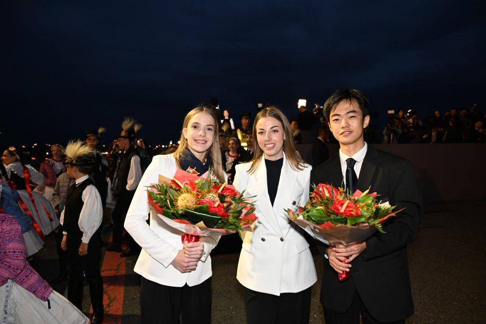 當(dāng)?shù)貢r(shí)間5月8日晚,在匈牙利布達(dá)佩斯國際機(jī)場,匈牙利姑娘歐拉·塔瑪拉(中)與匈中雙語學(xué)校兩名參加歡迎儀式的學(xué)生合影。