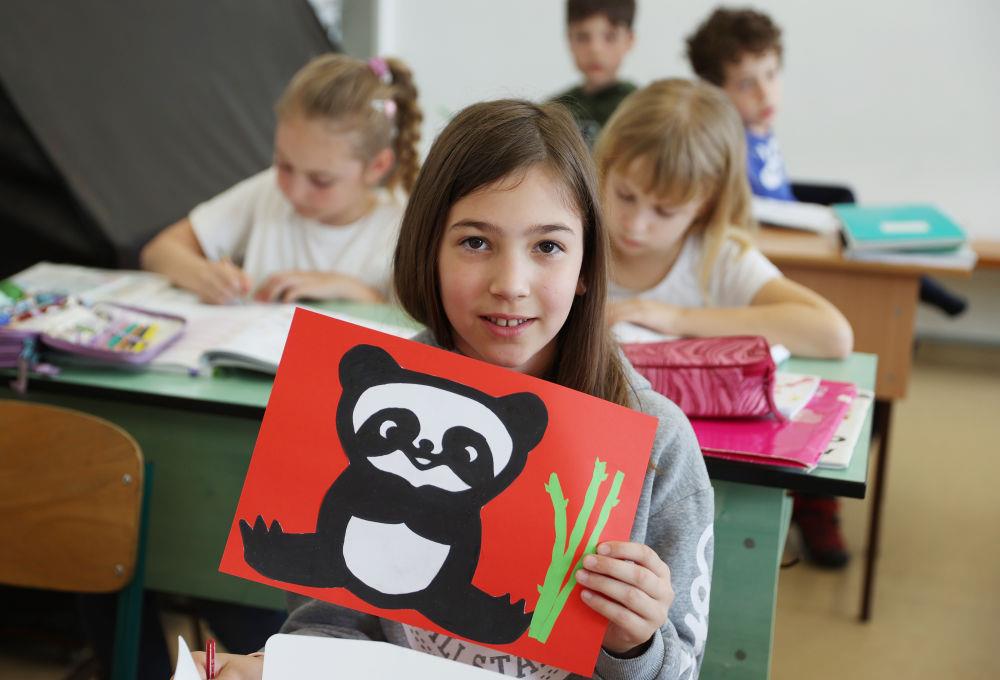2024年5月3日,匈中雙語學(xué)校三年級學(xué)生寶怡展示自己的大熊貓形象美術(shù)作品。