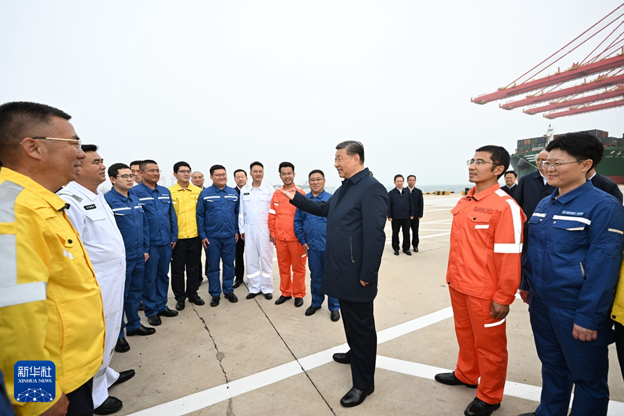 5月22日至24日,中共中央總書記、國家主席、中央軍委主席習近平在山東考察。這是22日下午,習近平在日照港親切慰問港口科技工作者、運營人員、航運人員。新華社記者 謝環馳 攝