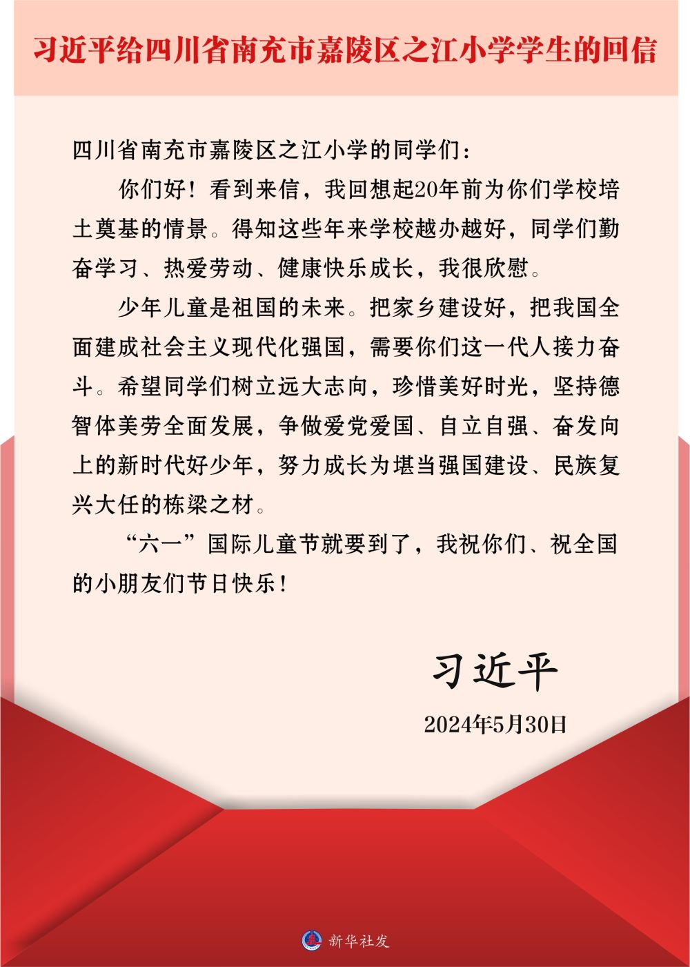 在“六一”國際兒童節即將到來之際,中共中央總書記、國家主席、中央軍委主席習近平5月30日給四川省南充市嘉陵區之江小學的學生們回信,對他們予以親切勉勵,并祝他們和全國的少年兒童節日快樂。