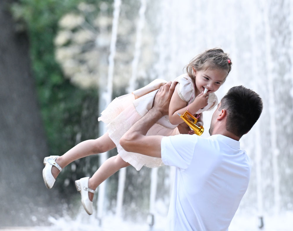 6月29日,在塔吉克斯坦首都杜尚別,一名男子在魯達基公園內與孩子玩耍。