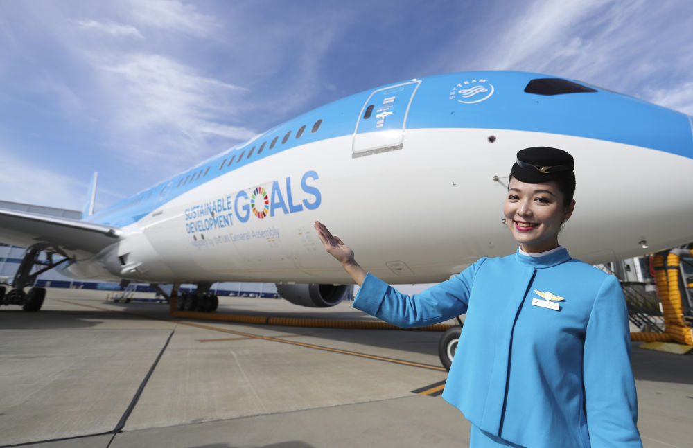 2018年1月26日,在美國查爾斯頓波音工廠,中國廈門航空公司的一名空乘人員展示廈航首架涂裝宣傳聯合國可持續發展目標的客機。新華社記者 王迎 攝