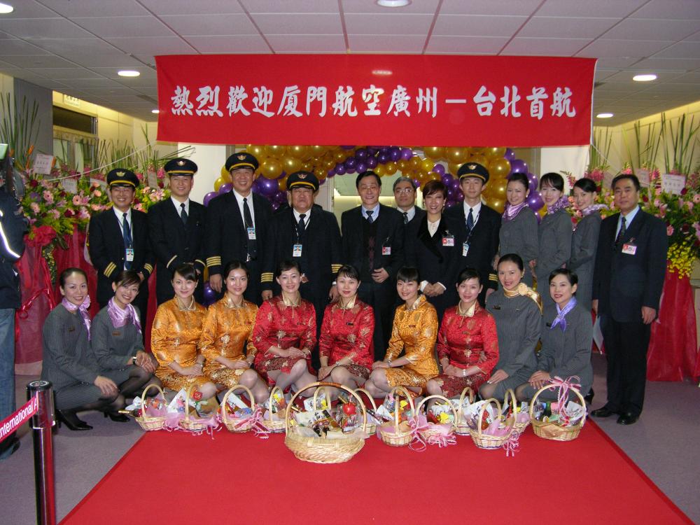 2005年,海峽兩岸首次開放春節包機。這是2005年1月29日,廈航作為大陸6家參與臺商春節包機直航的航空公司之一,圓滿完成了廣州-臺北往返包機任務。這是廈航首航臺北機組成員在臺北與迎接人員親切合影。