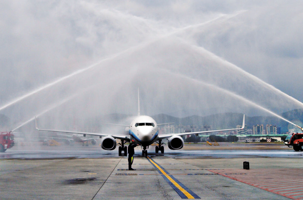 2008年,兩岸“三通”啟動常態包機,廈航成為廈門、福州和杭州航點的運營航空公司。這是2008年12月15日,臺北松山機場以“水門”儀式迎接廈航常態化包機。