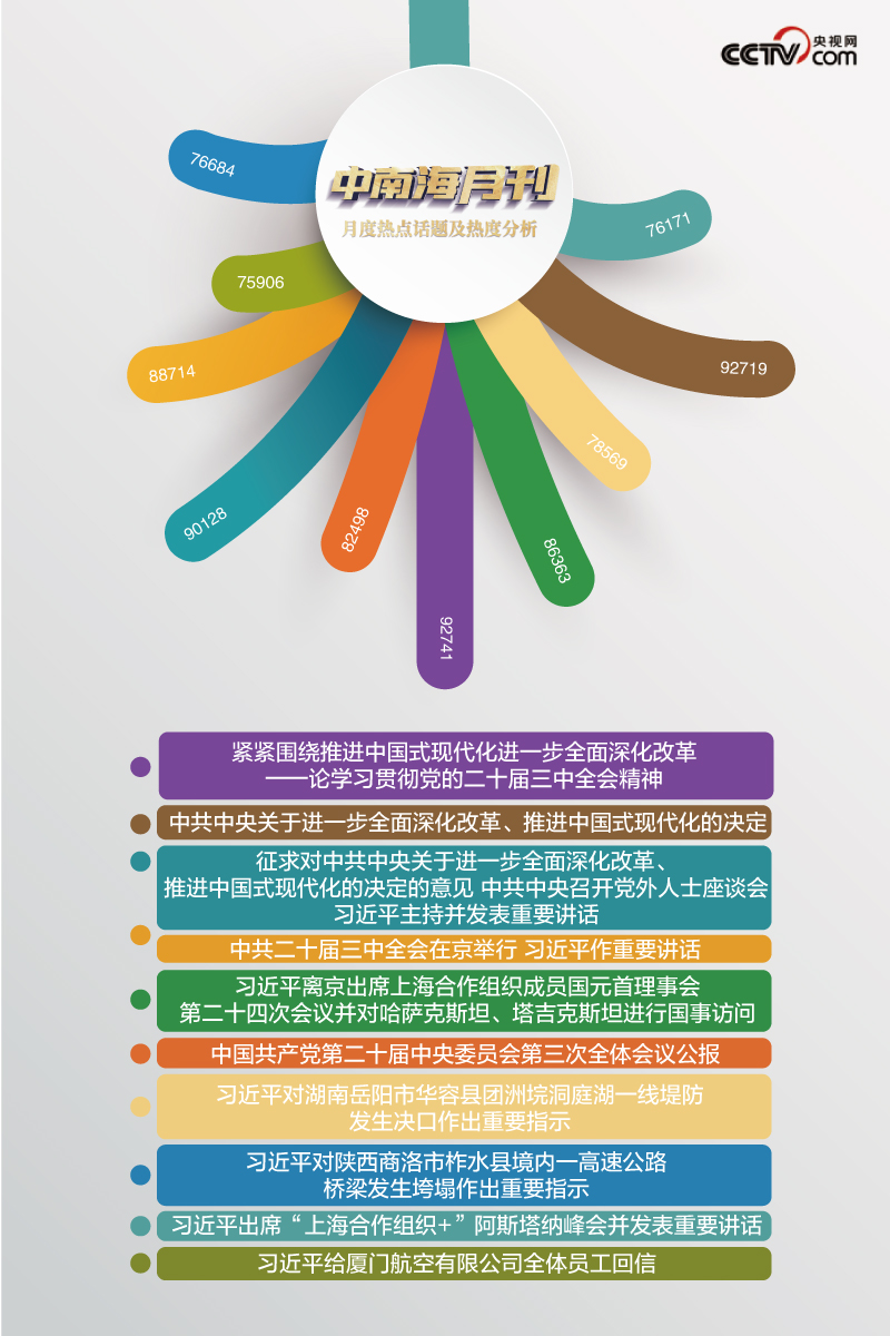 央視網“智聞”系統提取分析2024年7月全網時政新聞熱點顯示,本月“中共中央關于進一步全面深化改革、推進中國式現代化的決定”“中共二十屆三中全會在京舉行 習近平作重要講話”等話題備受關注。