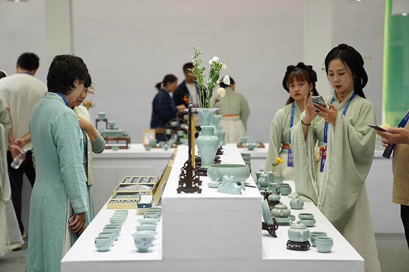 2023年10月18日,人們?cè)?023中國(guó)景德鎮(zhèn)國(guó)際陶瓷博覽會(huì)汝窯展臺(tái)參觀。