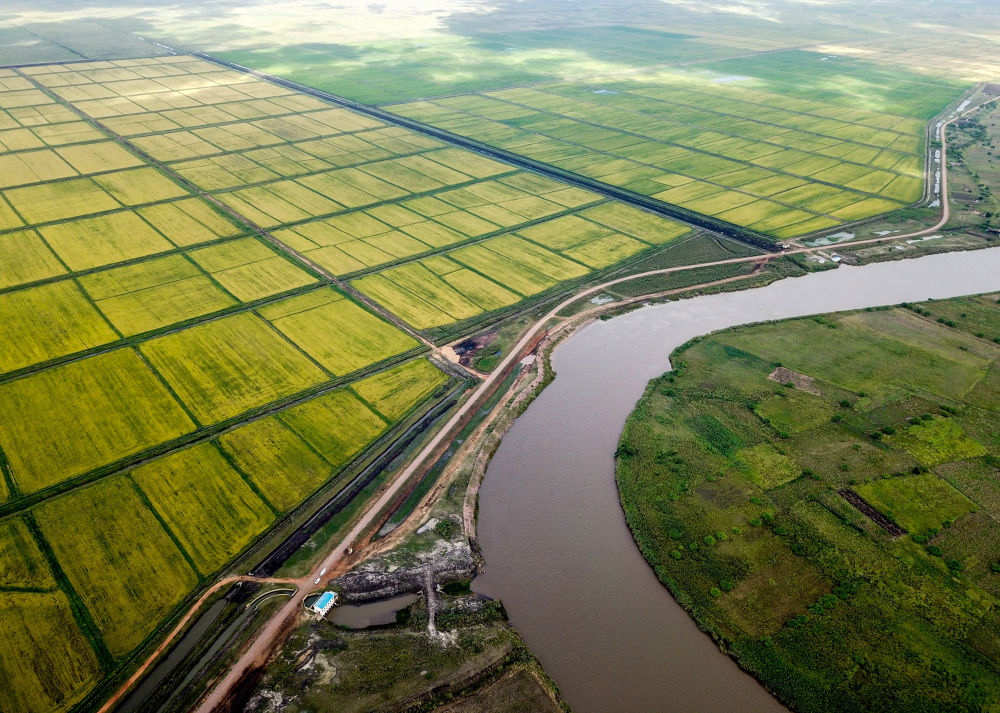 這是莫桑比克萬寶莫桑農業園的水稻田(2019年4月7日攝,無人機照片)。萬寶莫桑農業園是中非合作的大型水稻種植項目,極大地緩解了莫桑比克糧食短缺問題。