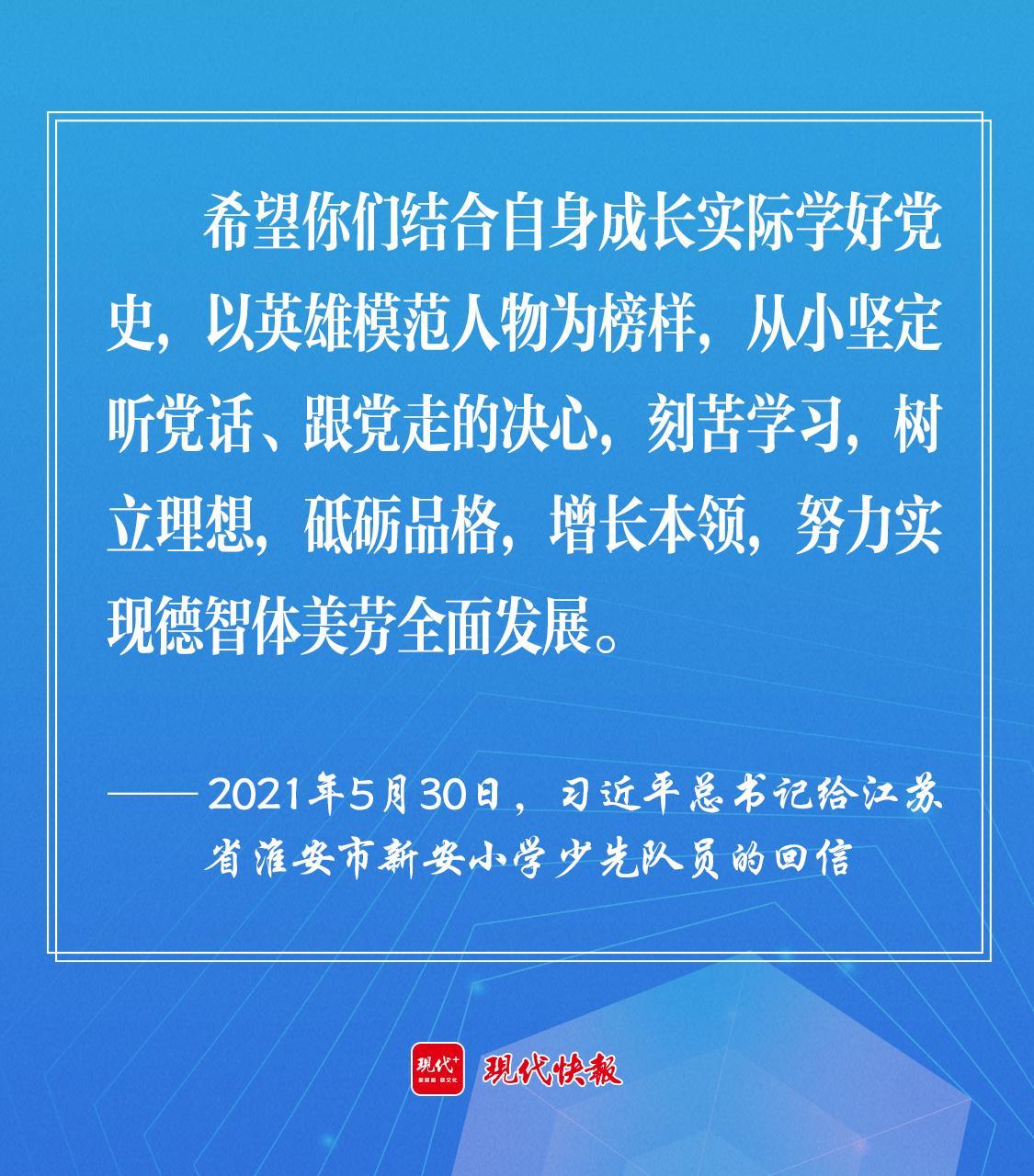 2021年5月30日,習近平總書記給江蘇省淮安市新安小學少先隊員回信時強調,“希望你們結合自身成長實際學好黨史,以英雄模范人物為榜樣,從小堅定聽黨話、跟黨走的決心,刻苦學習,樹立理想,砥礪品格,增長本領,努力實現德智體美勞全面發展。”