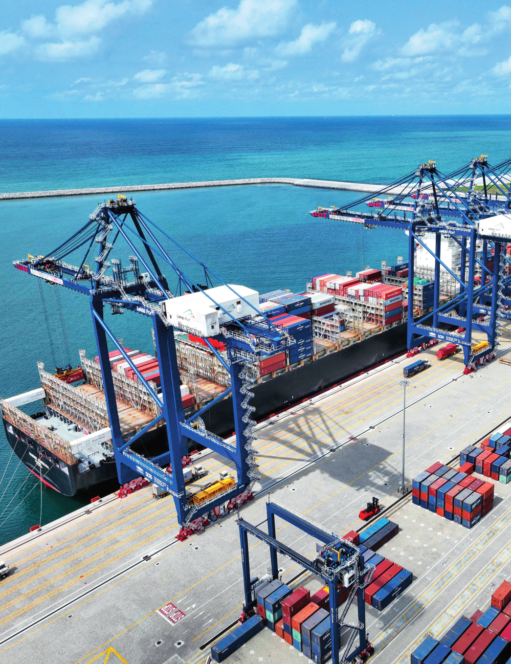 由中國港灣工程有限責任公司承建的尼日利亞萊基深水港位于中尼合作建設的拉各斯萊基自貿區內,是尼日利亞首個現代化深水港和最大港口。圖為一艘貨輪在尼日利亞拉各斯萊基深水港裝卸集裝箱(2024 年 3 月 11 日攝)萊基港公司供圖