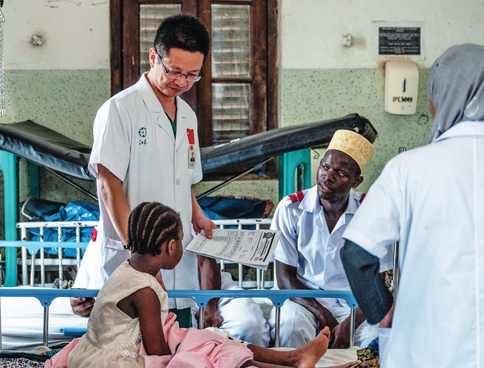 中國援桑給巴爾醫療隊隊長蔣國慶(左)在坦桑尼亞桑給巴爾的納茲莫加醫院查房(2023 年 12 月 29 日攝)王冠森攝 / 本刊
