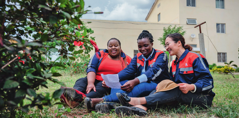 在肯尼亞內羅畢,非洲之星鐵路運營公司工電部電子設備檢修工區工長陳玲(右)在休息時教學員唱中文歌曲(2023年5月23日攝) 王冠森攝 / 本刊